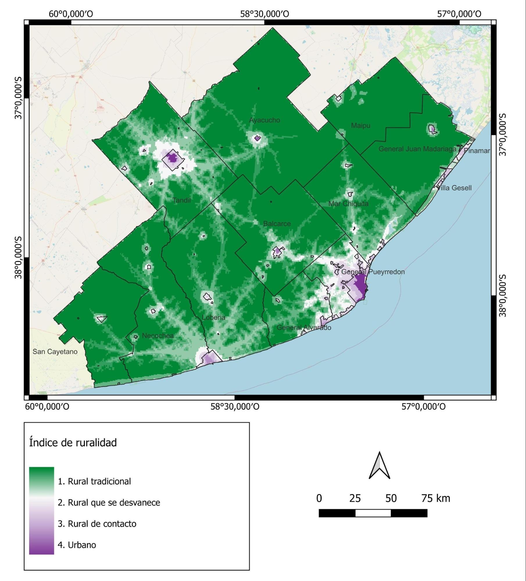 En relación con el IR para el sudeste de la provincia de Buenos Aires, la mayor superficie (94 %) está comprendida en el nivel más cercano a lo que se concibe como rural tradicional, caracterizado por la baja densidad de población, la dominancia de usos y coberturas del suelo ligado al sector agropecuario y, la escasa accesibilidad.
