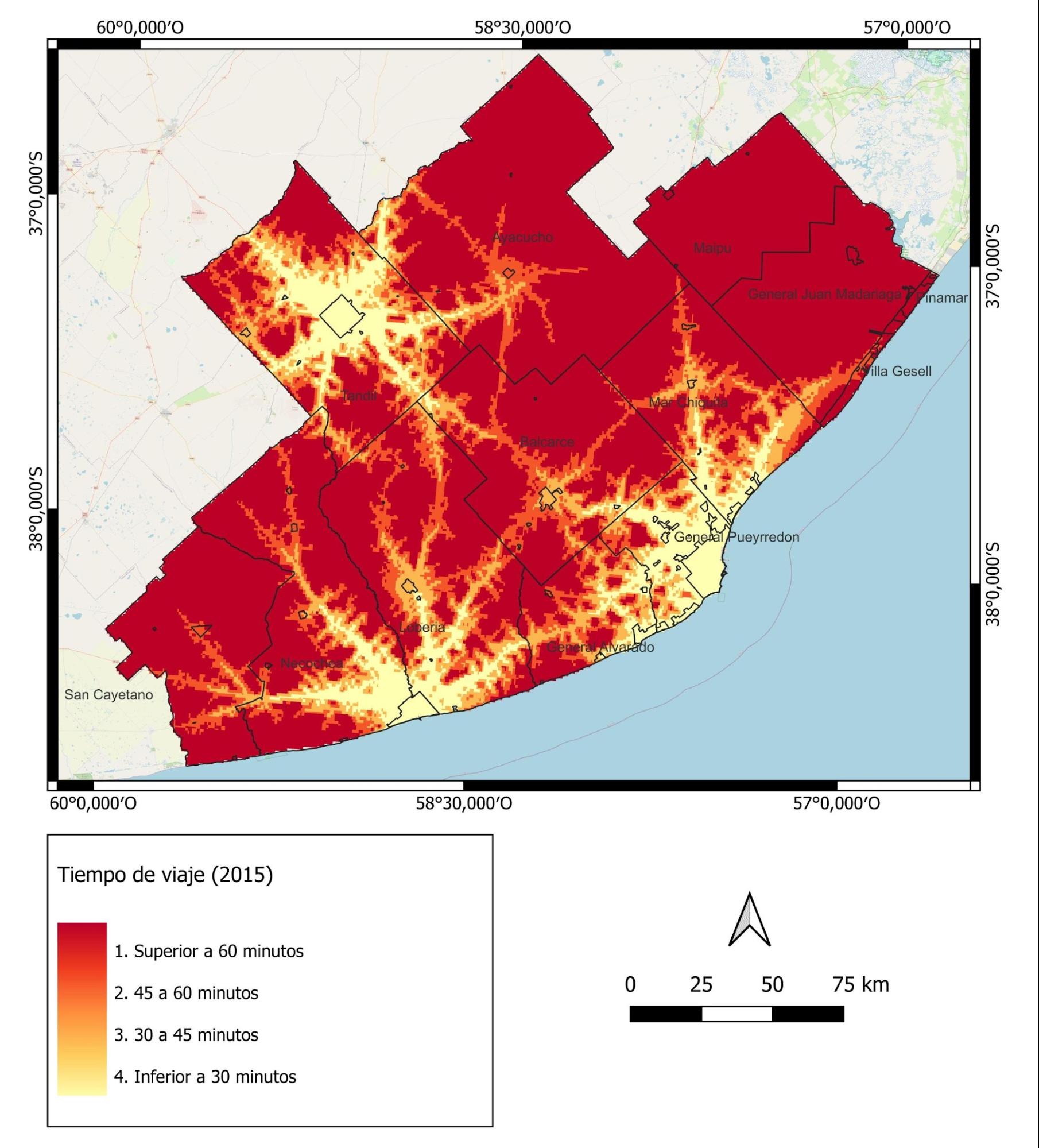 Los partidos de General Juan Madariaga, Maipú, Pinamar y Villa Gesell ostentan un tiempo de viaje mayor en comparación con otros territorios del sudeste bonaerense, en general conectados por vías de menor calidad o incluso sin pavimentar. Ayacucho, Balcarce y San Cayetano, poseen mayor cantidad de zonas con un tiempo de viaje de 30 a 45 minutos. General Alvarado, Lobería y Mar Chiquita son los partidos que, sin tener ciudades con más de 50.000 habitantes, poseen territorios que están a menos de 30 minutos de viaje a las ciudades de Mar del Plata, Necochea o Tandil.
