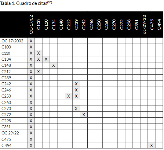 Por un lado, es destacable que en la totalidad de los casos referidos la Corte cita la opinión consultiva primigenia, constituyéndose así en texto fundacional del estándar. Sin embargo, en algunas ocasiones esa cita es acompañada con la de un caso anterior, y en otras no, por lo que no es posible encontrar un criterio uniforme al respecto.