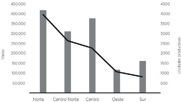 En cuanto a la distribución del número de vacas y unidades productivas en las diferentes regiones, La Pampa plantea una variabilidad importante (figura 7). La Región Norte destaca por tener el mayor número de vacas (417.582) y unidades productivas (3.995). Le sigue la Región Centro con el 30,4% de las vacas y el 22,8% de las unidades productivas, lo que también indica una participación significativa, aunque menor que la del Norte. La Región Centro-Norte aporta el 24,9% de las vacas (310.383) y el 26,6% de las unidades productivas (2.678), posicionándose como una región intermedia en términos de producción. Por otro lado, la Región Sur contribuye con solo el 12,9% de las vacas (161.281) y el 8% de las unidades productivas (809), y la Región Oeste tiene la menor participación con el 9,6% de las vacas (119.785) y el 10,8% de las unidades productivas (1.084).