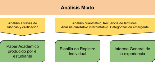 Nota. La experiencia integró tanto el paper final realizado por los estudiantes (Producto) así como las herramientas de registro de su experiencia (Proceso). Sobre ambos se aplicaron análisis tanto cuantitativos como cualitativos.