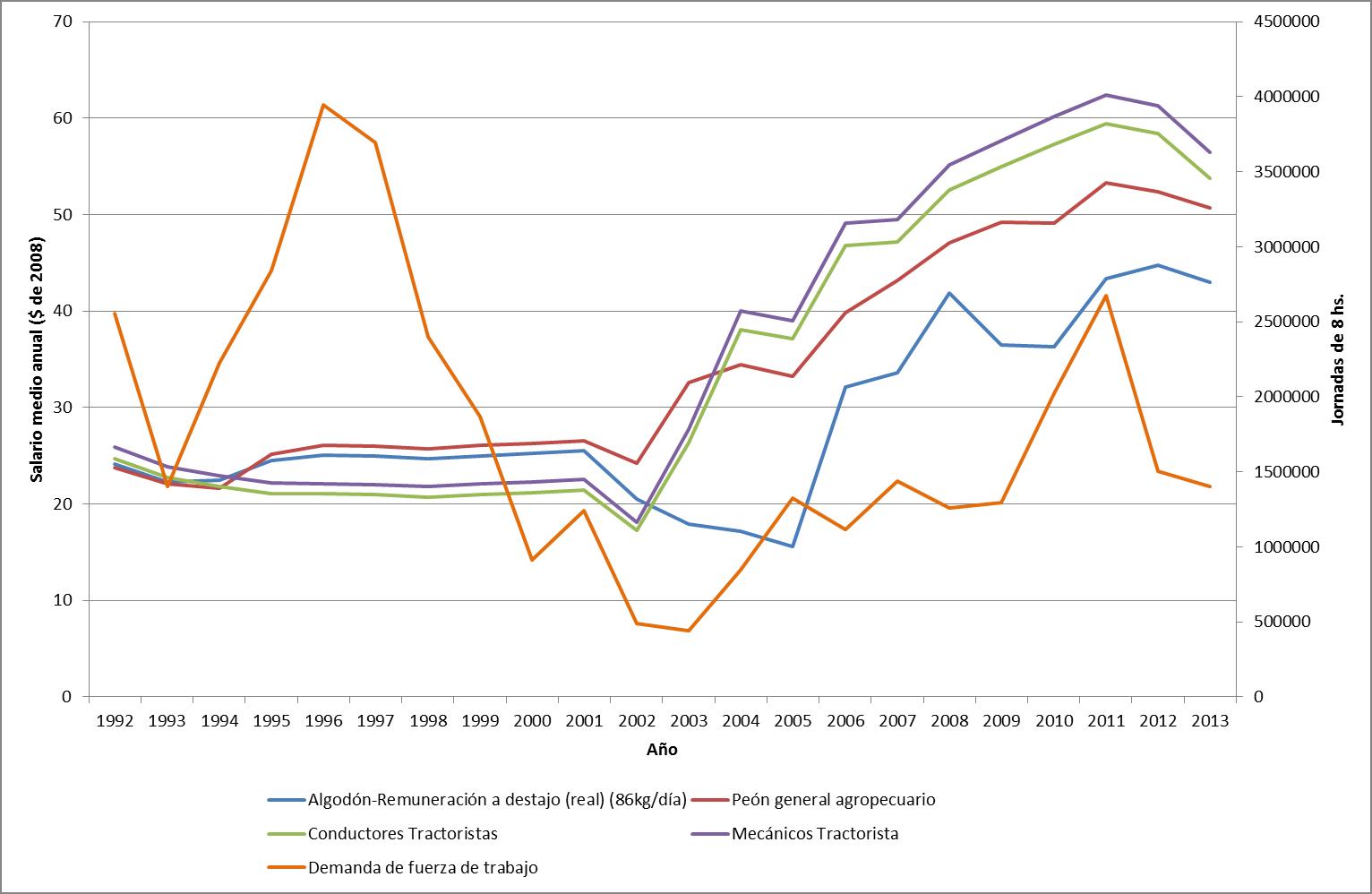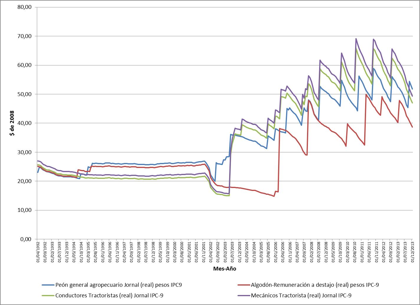 - Gráfico 1. Salarios de cosecheros manuales, de conductores tractoristas (jornales) y de peones generales (jornal) (en $ de 2008), (abril de 1992-julio de 2013) -a destajo con día típico=52 kg/día-