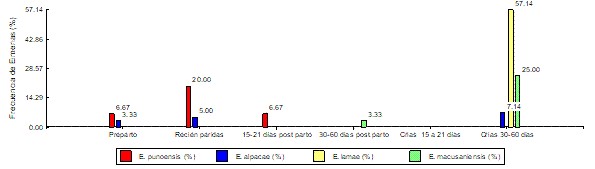 La mayor cantidad de ooquistes se visualizó en el grupo de crías de 30-60 días de edad y en cantidades de 30000 y 1000 OPG para E. lamae y E. macusaniensis, respectivamente. La cantidad de OPG es un reporte por espécimen, debido la escaza cantidad de ooquistes encontrados en los grupos; por lo tanto, los datos son expresados en frecuencia (%) de presentación de especies de eimerias por grupos (Tabla 1).