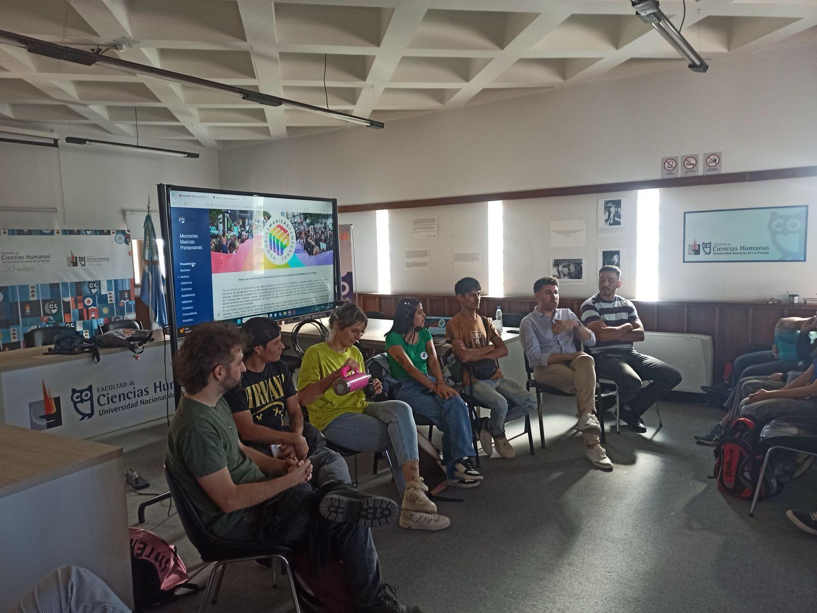 En un contexto nacional de clara avanzada en su agenda colectiva[4] al calor del agite militante que llevaba un proceso cada vez más persistente de visibilización[5] y organización, siguiendo el ritmo de las incipientes Marchas del Orgullo[6] en nuestros pagos, desde 2021 estudiantes y docentes de la Facultad de Ciencias Humanas formalizaron la primera acción de extensión (AEU) que luego siguió en 2023 como proyecto de extensión (PEU)[7] a fin de generar un espacio coparticipativo entre la universidad y la comunidad LGTBIQNB+ a favor de recuperar sus historias de luchas y resistencias en La Pampa.