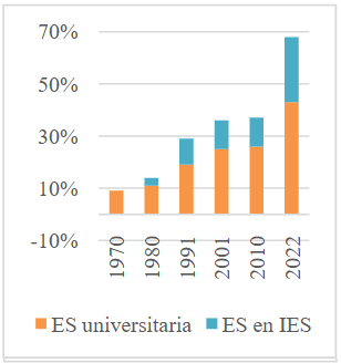 En Argentina, la información censal muestra el incremento continuo de la matrícula en los últimos cincuenta años, con dos momentos de crecimiento acentuado: los años que van desde el censo de 1980 al de 1991 y la etapa 2010 a 2022. El gráfico siguiente presenta la evolución de las tasas netas y brutas considerando los dos segmentos de la educación superior en nuestro país: las instituciones universitarias y los Institutos de Educación Superior (IES).