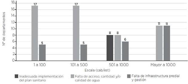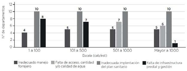 En las explotaciones medianas (101 a 500 y 501 a 1000 cabezas), se observa una distribución similar. La implementación del plan sanitario sigue siendo una de las principales preocupaciones, afectando a 10 departamentos en ambas escalas. La “Falta de acceso, cantidad y/o calidad de agua” también es importante, perjudicando a 5 departamentos en cada categoría. La variable infraestructura predial y gestión y el manejo forrajero también son identificados como problemas, pero con menor frecuencia. Se puede observar cómo la infraestructura se diferencia en las de menor tamaño, con relación a las de mayor. En las explotaciones de mayor tamaño, la “Inadecuada implementación del plan sanitario” se mantiene como la principal preocupación, afectando a 10 departamentos. En esta categoría, la “Falta de acceso, cantidad y/o calidad de agua” es menos frecuente, dañando a solo 6 departamentos, mientras que la “Falta de infraestructura predial y gestión” es un perjuicio significativo, con 10 departamentos afectados.