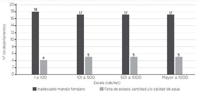 Finalmente, como prioridad menor, el acceso al agua se vuelve la principal preocupación indicando que, en escalas pequeñas, una vez resueltos los problemas más críticos, emergen otros como la infraestructura y el manejo del recurso hídrico. En las escalas medias, que abarcan entre 101 a 500 cab/est y 501 a 1000 cab/est, se observa una tendencia similar. El manejo forrajero sigue siendo la limitación predominante, afectando a 17 departamentos en ambas categorías. No obstante, la falta de acceso al agua continúa siendo un problema relevante. A medida que se avanza en las prioridades, la implementación del plan sanitario y la falta de infraestructura predial ganan importancia, reflejando la complejidad creciente de las operaciones a medida que aumenta el tamaño de los establecimientos. Para mejorar estos aspectos se presenta el diseño de sistemas de producción que incorporen estas limitantes, así como también es fundamental coordinar acciones con otros organismos e impulsar inversiones en infraestructura y en el manejo de los instrumentos financieros (créditos, ANR, otros).