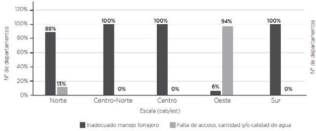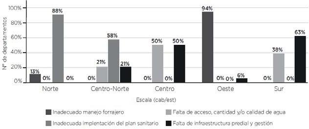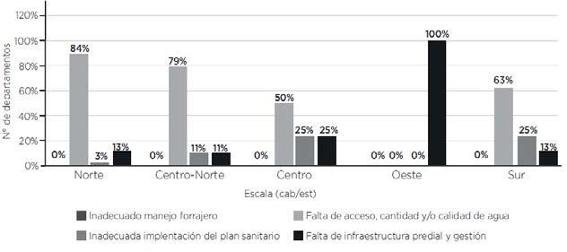 En la región Centro se presenta la falta de acceso al agua con impacto en el 50% de los departamentos de la región. Luego se dividen, en partes iguales, la inadecuada implementación del plan sanitario y la infraestructura predial. Esta diversidad de limitaciones indica que las intervenciones en esta zona deben ser integrales, abordando múltiples aspectos de la producción para lograr mejoras significativas. La región Oeste muestra una concentración única en la falta de infraestructura predial, afectando al 100% de los departamentos. Esto sugiere que, en esta zona, la infraestructura y la gestión empresarial son el principal desafío en orden 3 de las prioridades para la producción ganadera, y cualquier esfuerzo de mejoramiento debería centrarse en la construcción u optimización de instalaciones y equipamientos que faciliten la cría y el manejo del ganado.