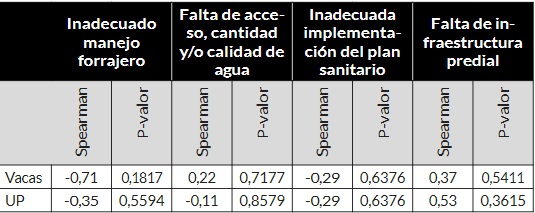 Los resultados del análisis de correlación de Spearman entre las variables “número de vacas” y “número de unidades productivas” con las prioridades tecnológicas en la ganadería de cría no muestran relaciones estadísticamente significativas (Tabla 1). Específicamente, se observó una correlación negativa moderada entre el número de vacas y la prioridad “Inadecuado manejo forrajero” (coeficiente de -0,71), pero el P-valor de 0,1817 indica que esta correlación no es significativa a un nivel de confianza del 95%. Del mismo modo, aunque hay una correlación positiva moderada entre el número de unidades productivas y la prioridad “Falta de infraestructura predial” (coeficiente de 0,53), el P-valor de 0,3615 también sugiere que esta relación no es significativa. Las correlaciones con la “Falta de acceso, cantidad y/o calidad de agua” y “Inadecuada implementación del plan sanitario” fueron débiles y con P-valores altos, indicando la falta de significancia estadística.