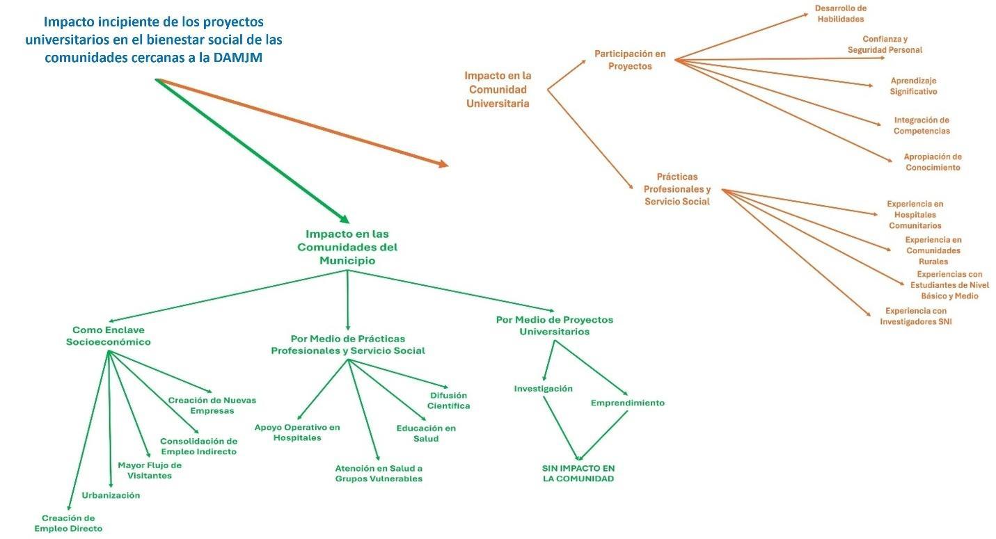 Para el análisis final de los datos, se utilizó la herramienta de diagrama de afinidad, con la cual se agruparon los datos afines emergentes de todas las técnicas de información aplicadas a las distintas fuentes de información consultadas. Esta agrupación de datos emergió de la siguiente manera: dimensión “Impacto incipiente de los proyectos universitarios en el bienestar social de las comunidades cercanas a la DAMJM” (Dim. 1), de la que se desprenden dos categorías: “impacto en las comunidades del municipio” (Cat. 1) e “impacto en la comunidad universitaria” (Cat. 2). De estas categorías, se desprenden cinco códigos: “como enclave socioeconómico” (Cod. 1), “por medio de prácticas profesionales y servicio social” (Cod. 2), “por medio de proyectos universitarios” (Cod. 3), “participación en proyectos” (Cod. 4) y “prácticas profesionales y servicio social” (Cod. 5). De los códigos, se derivaron veinte subcódigos: “creación de empleo directo” (Sub. 1), “urbanización” (Sub. 2), “mayor flujo de visitantes” (Sub. 3), “consolidación de empleo indirecto” (Sub. 4), “creación de nuevas empresas” (Sub. 5), “apoyo operativo en hospitales” (Sub. 6), “atención en salud a grupos vulnerables” (Sub. 7), “educación en salud” (Sub. 8), “difusión científica” (Sub. 9), “investigación” (Sub. 10), “emprendimiento” (Sub. 11), “desarrollo de habilidades” (Sub. 12), “confianza y seguridad personal” (Sub. 13), “aprendizaje significativo” (Sub. 14), “integración de competencias” (Sub. 15), “apropiación de conocimiento” (Sub. 16), “experiencia en hospitales comunitarios” (Sub. 17), “experiencia en comunidades rurales” (Sub. 18), “experiencia con alumnos de nivel básico y nivel medio” (Sub. 19) y “experiencia con investigadores del Sistema Nacional de Investigación (SNI)” (Sub. 20).
