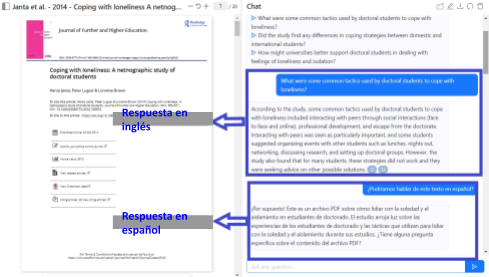 Un aspecto interesante de ChatPDF consiste en la posibilidad de cargar un documento en un idioma y «chatear» con la herramienta en otro. Esta opción es importante, ya que puede ayudar a los hispanohablantes a leer textos en inglés, como se muestra en la imagen 21.