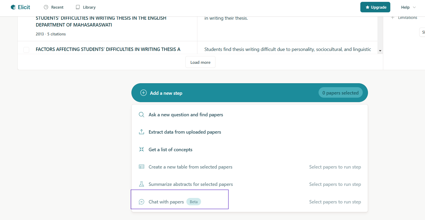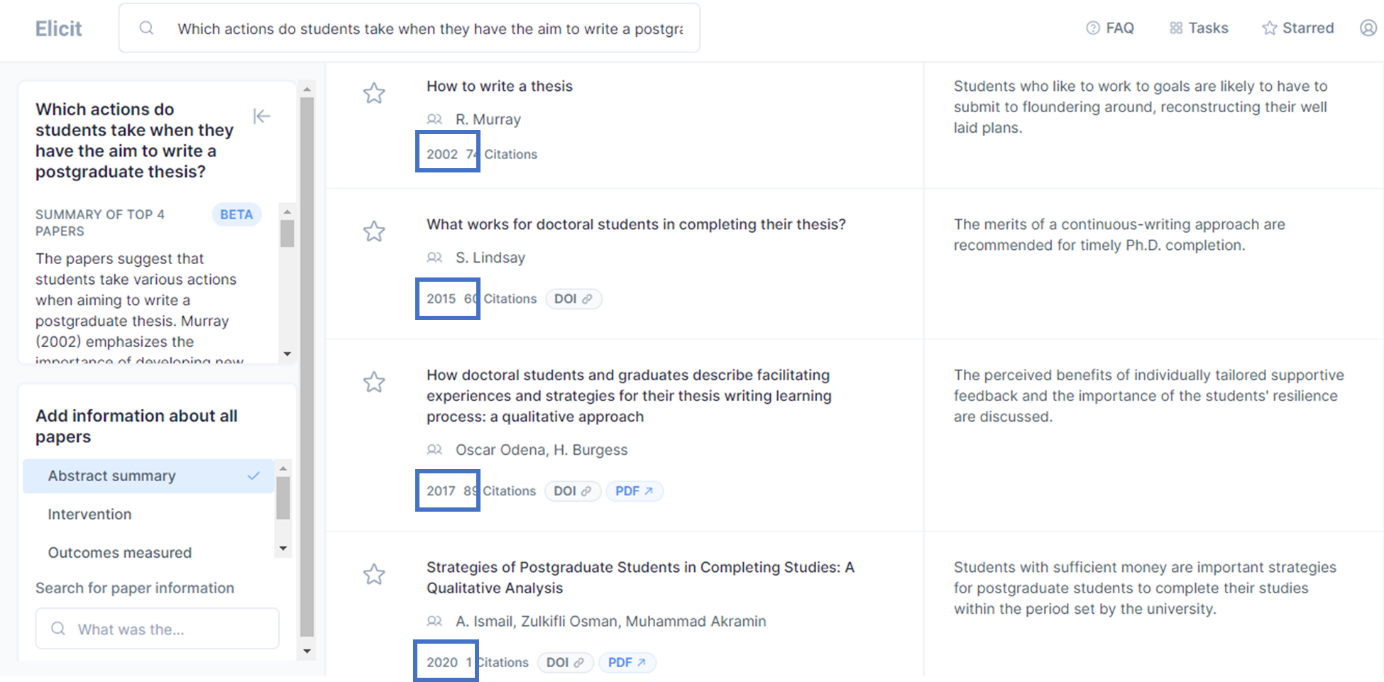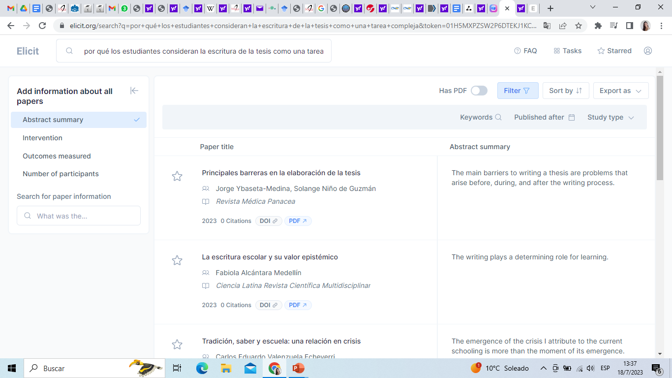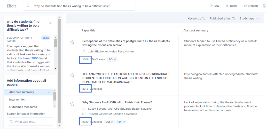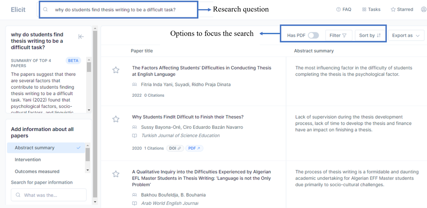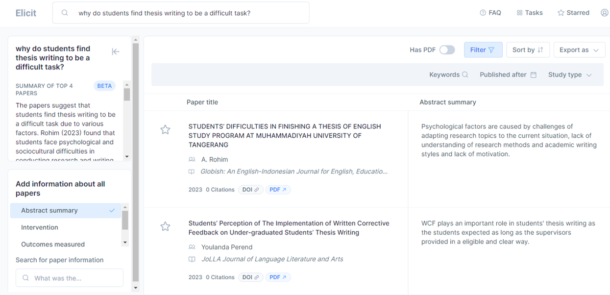 En nuestra primera revisión en julio de 2023, para probar la herramienta, como muestra la Imagen 1, formulamos una pregunta en inglés: «Why do students find thesis writing to be a difficult task?». En los resultados iniciales, obtuvimos más de 200 materiales relacionados con el tema con referencias y resúmenes, cuyo orden de presentación parece aleatorio. No obstante, el sistema provee algunas opciones para filtrar los resultados según determinados criterios.