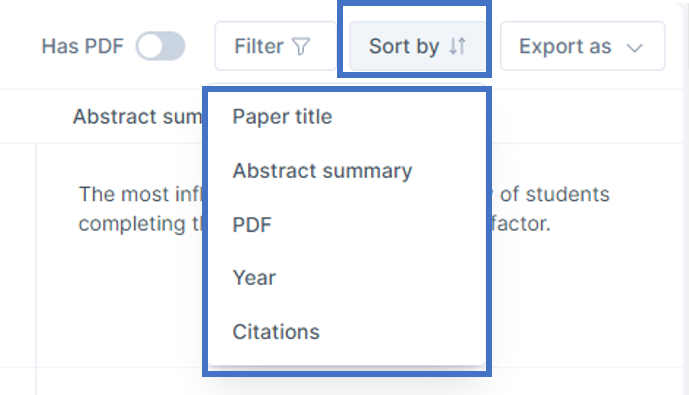 Elicit también brinda la opción de ordenar los resultados según determinados metadatos: título, resumen del “abstract”, indica si hay un pdf disponible, año de publicación y número de citas, como se muestra a continuación.
