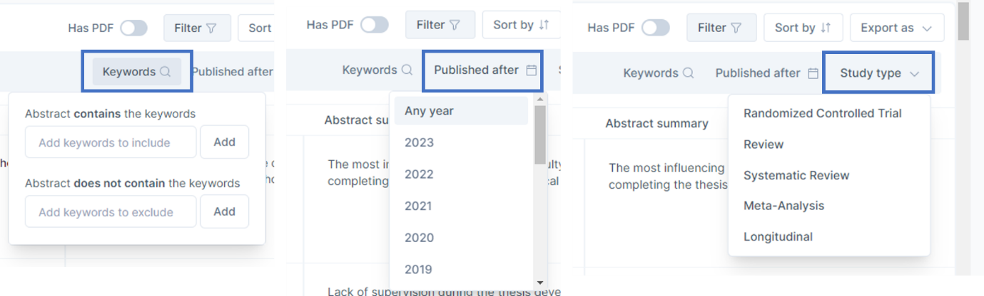 En 2023, en Elicit existían tres posibilidades que, solas o combinadas, permitían a los usuarios afinar su búsqueda (véase Imagen 2). El primer filtro, palabras clave, habilita seleccionar términos para incluir o excluir materiales; el segundo filtro, fecha de publicación, restringe la selección a artículos publicados después de un determinado año; y el tercer filtro, tipo de estudio, posibilita escoger materiales según el tipo de investigación que se relata en los trabajos.