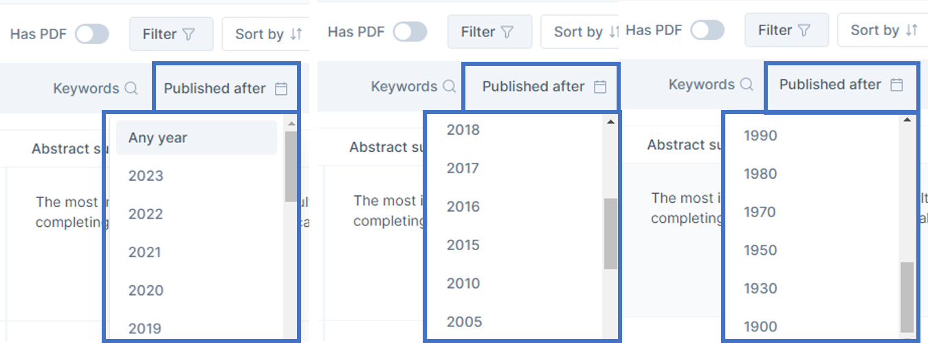 Otra opción que ofrece Elicit es filtrar los resultados por año de publicación. El sistema organiza los materiales en distintos rangos temporales: de 1900 a 2023. Desde el año en curso hasta 2015, los usuarios pueden seleccionar los materiales por año, pero después de ese año las opciones se agrupan en intervalos de 5 años. Para el período comprendido entre 1990 y 1970, los rangos son de 10 años y, por último, las únicas opciones disponibles para fechas anteriores son 1950,1930 y 1900 (véase Imagen 5).