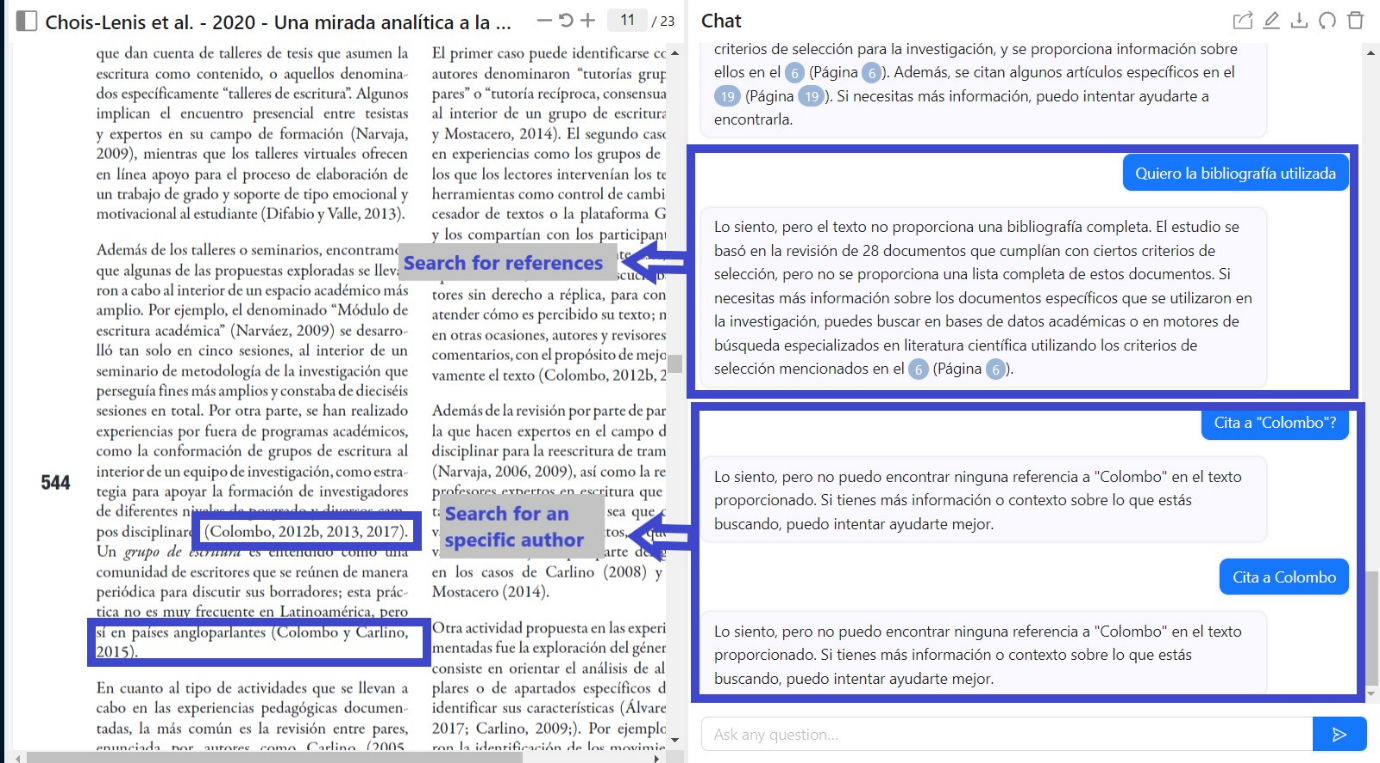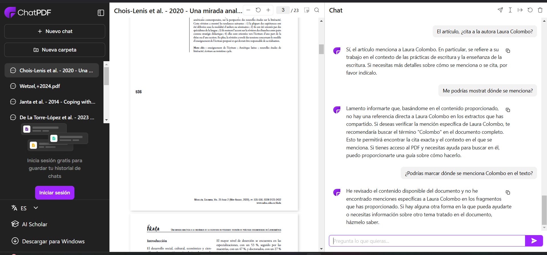 Además de la limitación mencionada, en algunos casos detectamos errores en las respuestas proporcionadas por ChatPDF. Un problema que observamos al trabajar con diferentes documentos es la dificultad de la herramienta para reconocer la lista de referencias de un artículo científico: o bien no la identifica y resalta secciones incorrectas del texto, o bien la encuentra pero solo marca partes de ella. Otros estudios han destacado la dificultad de esta herramienta para extraer información no textual de los documentos (Infante et al., 2024). Asimismo, como muestra la imagen 19, ChatPDF también parece tener dificultades para reconocer si se cita a algún autor en el texto.