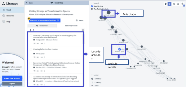 La plataforma utiliza un artículo como «semilla» (Imagen 12) para producir una representación gráfica de los trabajos relacionados con el introducido. Brinda diferentes tipos de visualización que permiten identificar los materiales relacionados con el artículo semilla. Los resultados se pueden ordenar por relevancia, número de citas y año, entre otros. En 2023, algunas funciones, como el modo “Descubrir” y la generación de un mapa gráfico, requerían una suscripción paga. En 2025, encontramos aún más limitaciones para la cuenta gratuita, las cuales iremos desarrollando en detalle.