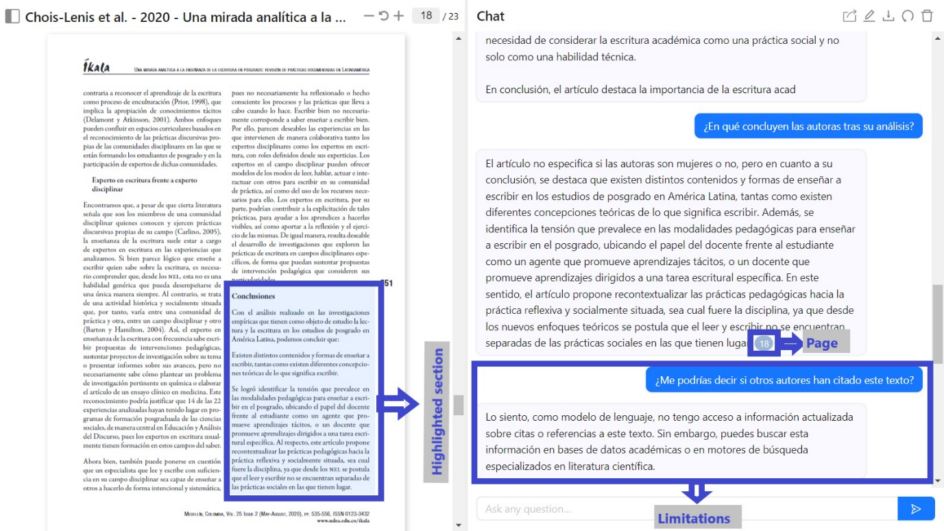 En términos generales, ChatPDF podría ser útil en la etapa de selección de los documentos en una revisión de la literatura, dado que ayuda a realizar preguntas específicas sobre los documentos y así descartarlos o no para una investigación. En efecto, esta herramienta exhibe una capacidad de respuesta clara a las consultas de los usuarios, fundamentada en la información contenida en el documento cargado. Su utilidad es particularmente importante en los estadios iniciales de la investigación, ya que facilita la lectura panorámica o exploratoria de los materiales. Esta práctica es común entre los investigadores, quienes la emplean para determinar la relevancia e interés de los materiales encontrados en el contexto de su estudio. No obstante, en concordancia con lo mencionado por Infante y colegas (2024), resulta imperativo señalar que esta herramienta no reemplaza la lectura exhaustiva de los textos, un proceso indispensable para que los tesistas puedan defender sus propuestas. Si bien una lectura exploratoria es beneficiosa para un primer acercamiento, confiar únicamente en ella les podría generar dificultades para sostener sus argumentos.