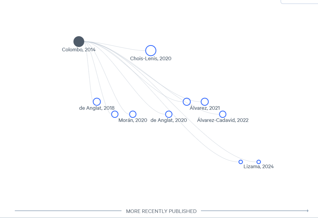 Como se observa en la imagen anterior, todos los gráficos generados se basan en el análisis de los patrones de citación de los artículos vinculados al documento semilla. Esta herramienta, por tanto, tiene la capacidad de revisar millones de publicaciones en segundos y seleccionar aquellas con mayor conexión con la semilla.