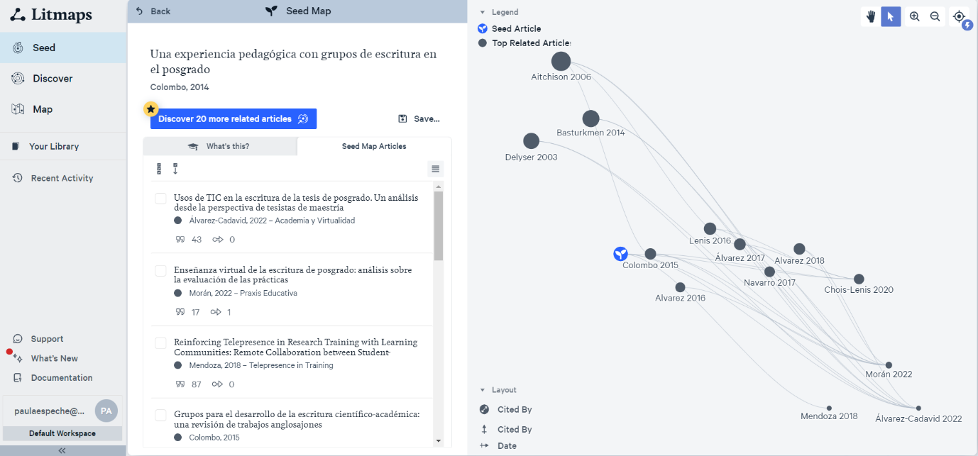 Al utilizar la herramienta, la mayoría de las visualizaciones nos parecieron claras y estéticamente agradables. Además, parecían útiles para obtener una visión general de los artículos vinculados a la información proporcionada. En la primera exploración de 2023, observamos que, a diferencia de Elicit, la calidad de los resultados fue la misma cuando se emplearon artículos semilla escritos en inglés o en español (Imagen 15). Vinculamos esta característica al hecho de que Litmaps opera con una base de datos en línea.