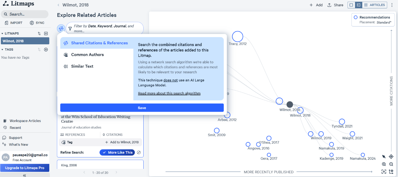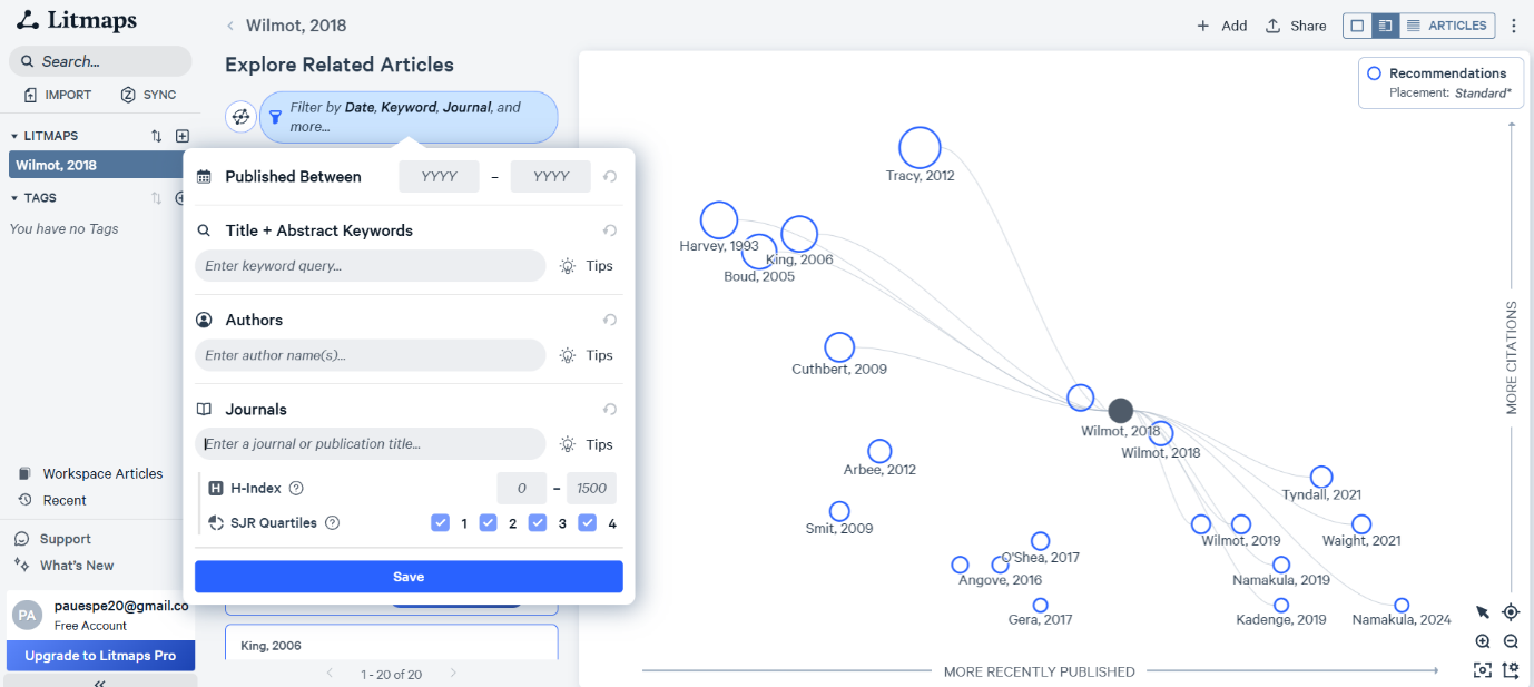 Así, analizando la información proporcionada por esta herramienta, los usuarios pueden identificar nuevos artículos y palabras clave relevantes para su investigación, incluidos aquellos publicados después del artículo semilla. Además, los resultados pueden guardarse en forma de gráfico, descargarse a un dispositivo o vincularse a un software de gestión de citas como Zotero o Mendeley.