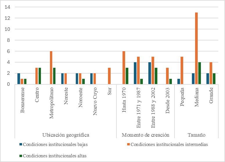 Encontramos 13 casos en donde las condiciones institucionales son más altas que los niveles de inclusión. Identificamos un subgrupo conformado por dos casas de estudio en donde las condiciones institucionales son altas y el grado de inclusión es bajo y otras dos en donde las condiciones institucionales son altas y el grado de inclusión es intermedio. En estos cuatro casos, los informes son muy recientes, por lo que entendemos que todavía esas condiciones, plasmadas en acciones institucionales que han sido consideradas en un informe de evaluación favorable, pueden no haber impactado aún de manera significativa. En este sentido, es esperable que los grados de inclusión mejoren en los próximos años.