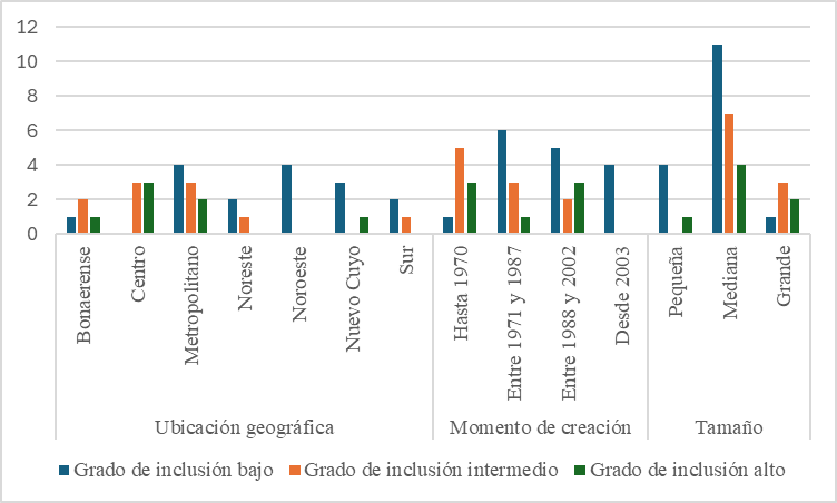La mayoría de las universidades presenta un bajo grado de inclusión (16), seguido por las universidades con grado intermedio (10) y un grupo más reducido con grado de inclusión alto (7). En el Gráfico 2, se describe cómo se distribuyen los casos estudiados, teniendo en cuenta la ubicación geográfica, el momento de creación y el tamaño.