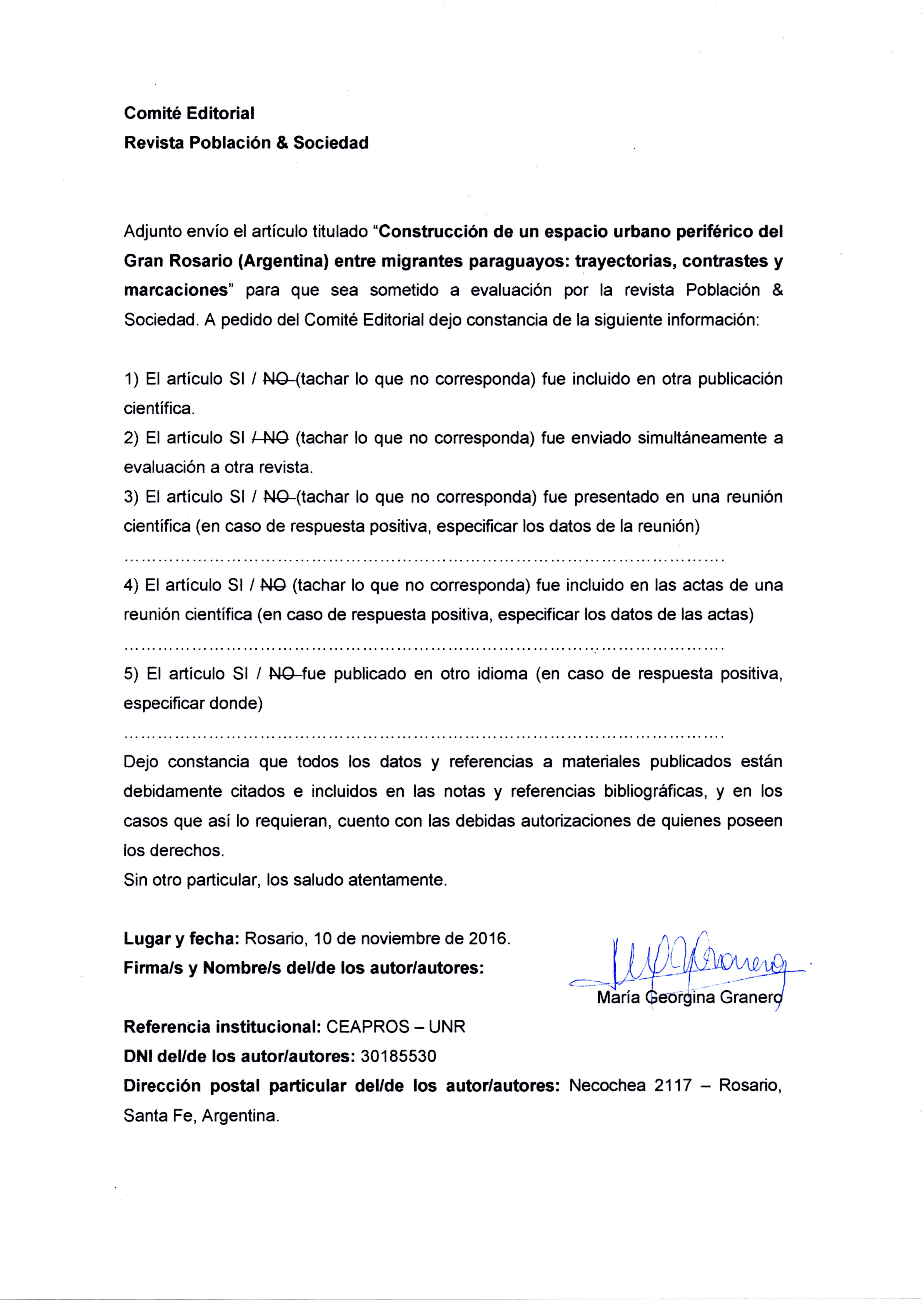 Si el mismo fuera aceptado para su publicación en Población & Sociedad, autorizo a la referida revista a publicarlo en forma digital y a publicitarlo en sus redes sociales.