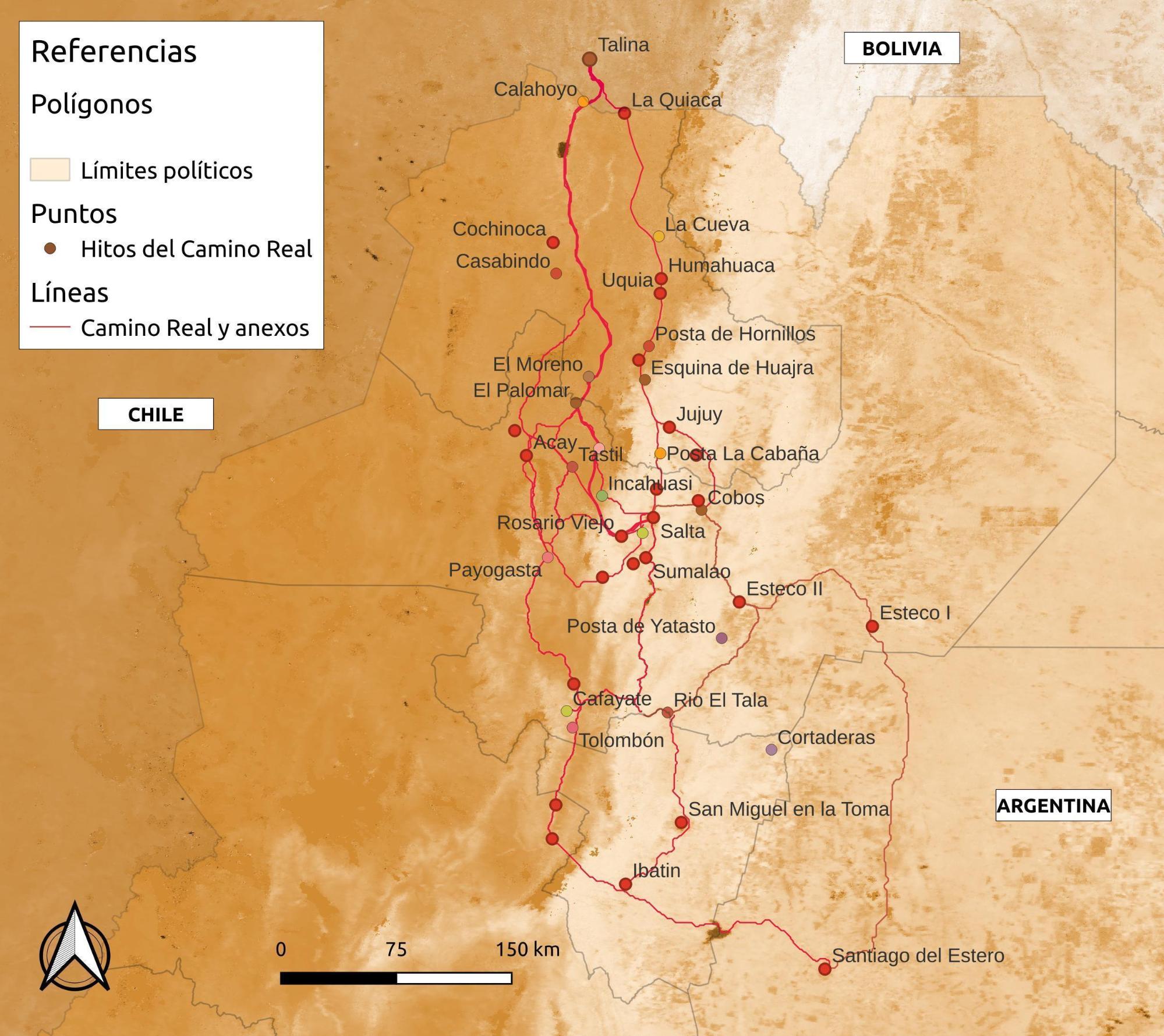 Esta amplia red de comunicaciones tejida por el imperio incaico quedó reducida a su mínima expresión con la consolidación del poder español en el Tucumán (Mignone, 2022). Bajo el nombre de “camino real” se conoce comúnmente al recorte que se realizó sobre el Qhápaq Ñán [sistema vial incaico], que unía las ciudades más importantes de la Gobernación del Tucumán, generalmente las sedes de las arcas reales y, al final del período, el camino sobre el cual se asentó el sistema de postas. No era un solo camino, se trataba en realidad de una red de vías que presentaba tramos anexos y secundarios. Muchos de ellos recibieron también el calificativo de “reales” en ciertas ocasiones y comunicaban las jurisdicciones de Salta con la de Jujuy en sentido longitudinal y transversal, tanto por los valles como por la Puna y el oriente selvático. Los caminos de orientación longitudinal (norte-sur), particularmente, llevaron el apelativo de “camino al Perú”.