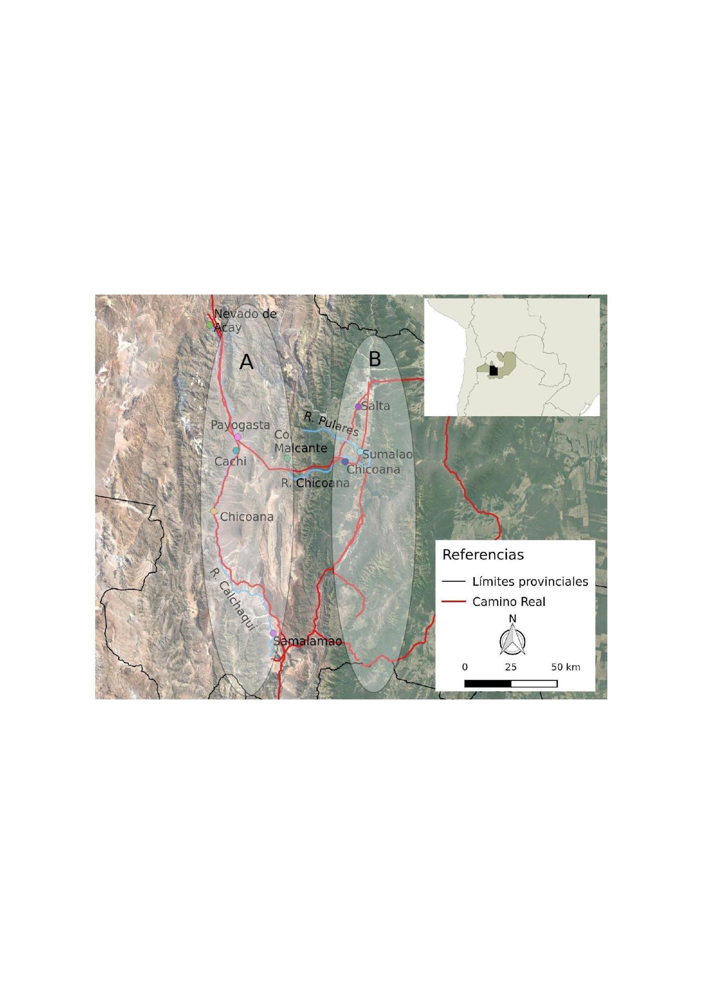 Este camino occidental ingresaba desde la puna, por el Nevado de Acay, a más de 100 km hacia el noroeste del valle de Salta, para adentrarse en el valle Calchaquí y recorrer hasta el valle de Yocavil. En este derrotero conectaba la gran cuenca endorreica de Salinas Grandes-Las Burras-Guayatayoc, límite meridional de las tierras ocupadas por los casabindos y los cochinocas (Albeck, 2019) y la subcuenca del río Calchaquí, sistema hidrográfico en cuyas terrazas y márgenes se asentaron numerosas poblaciones que fueron conocidas bajo el dominio colonial como cachis, payogastas, pulares, chicoanas, atapsis, sichas, cafayates, adscriptos según su cambiante sujeción al orden español bajo los etnónimos de pulares y calchaquíes (Lorandi y Boixadós, 1988; Giudicelli, 2018).