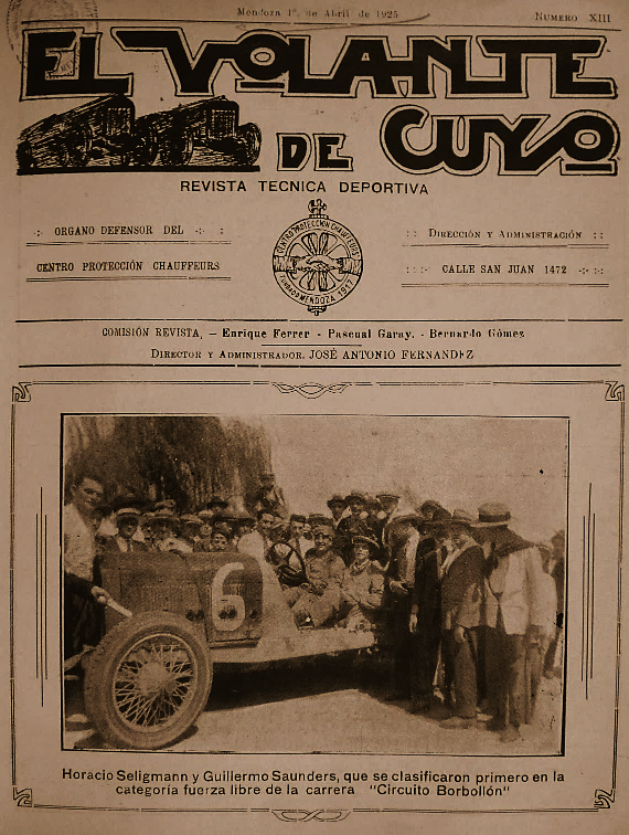 Fuente: Horacio Seligman y Guillermo Saudera, que se clasificaron primero en la categoría fuerza libre de la carrera “Circuito Borbollón” (1° de abril de 1925). El Volante de Cuyo, portada. Biblioteca Pública General San Martín, Mendoza, Argentina.