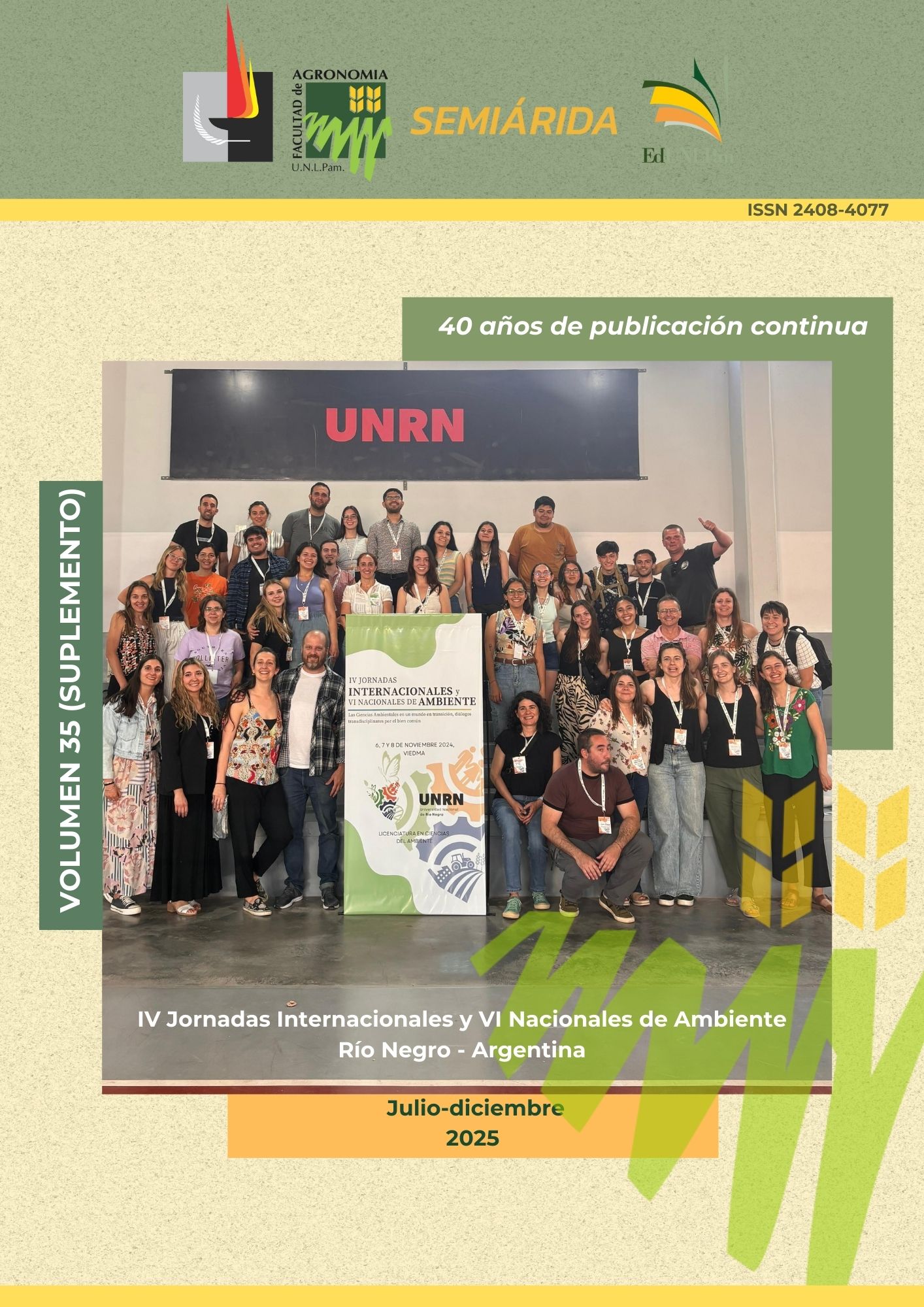 Vol. 35 Núm. Suplemento (2025)Este suplemento especial de Semiárida compila trabajos extendidos presentados en las IV Jornadas Internacionales y VI Nacionales de Ambiente. Dichas jornadas se llevaron a cabo el 6 de noviembre de 2024 en el ámbito de la Universidad Nacional de Río Negro (UNRN), bajo el lema “Las Ciencias Ambientales en un mundo en transición: diálogos transdisciplinares por el bien común”.
