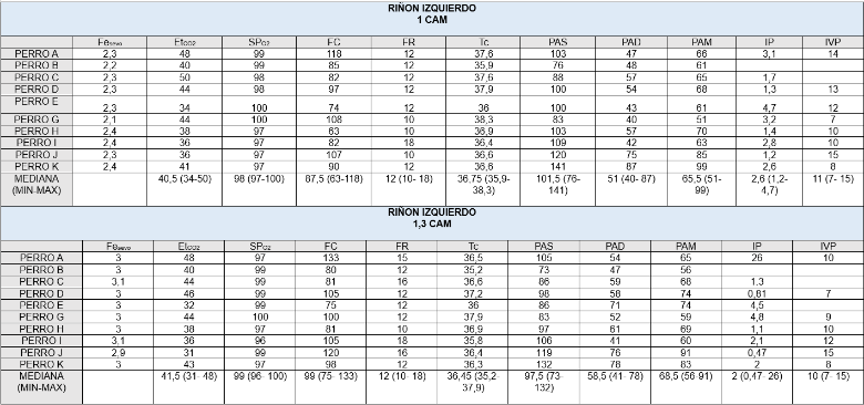 Tabla 2. Valores de los parámetros de monitoreo medidos en perros anestesiados a 1 y 1,3 CAM de sevoflurano y ventilados mecánicamente, pertenecientes al riñón izquierdo, en el momento del registro Doppler.