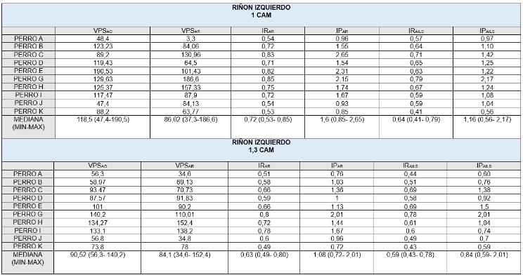 Tabla 1. Valores de las variables medidas con Doppler en perros anestesiados a 1 y 1,3 CAM de sevoflurano y ventilados mecánicamente, pertenecientes al riñón izquierdo.