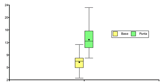Diagrama de caja: el eje X indica la "base" y la "punta" como variable cualitativa. En el eje Y son los pg/mg